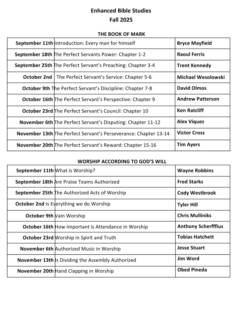 The Enhanced Bible Studies takes place at Northern Oaks Church of Christ in the annex at 7:00pm every Thursday during the spring and fall. We have two classes each night. One on a book of the Bible and the other on a topical Bible subject. Dinner is served at 6:45pm. This is an excellent way to learn more about God’s Word, to get to know others from our community and sister congregations.